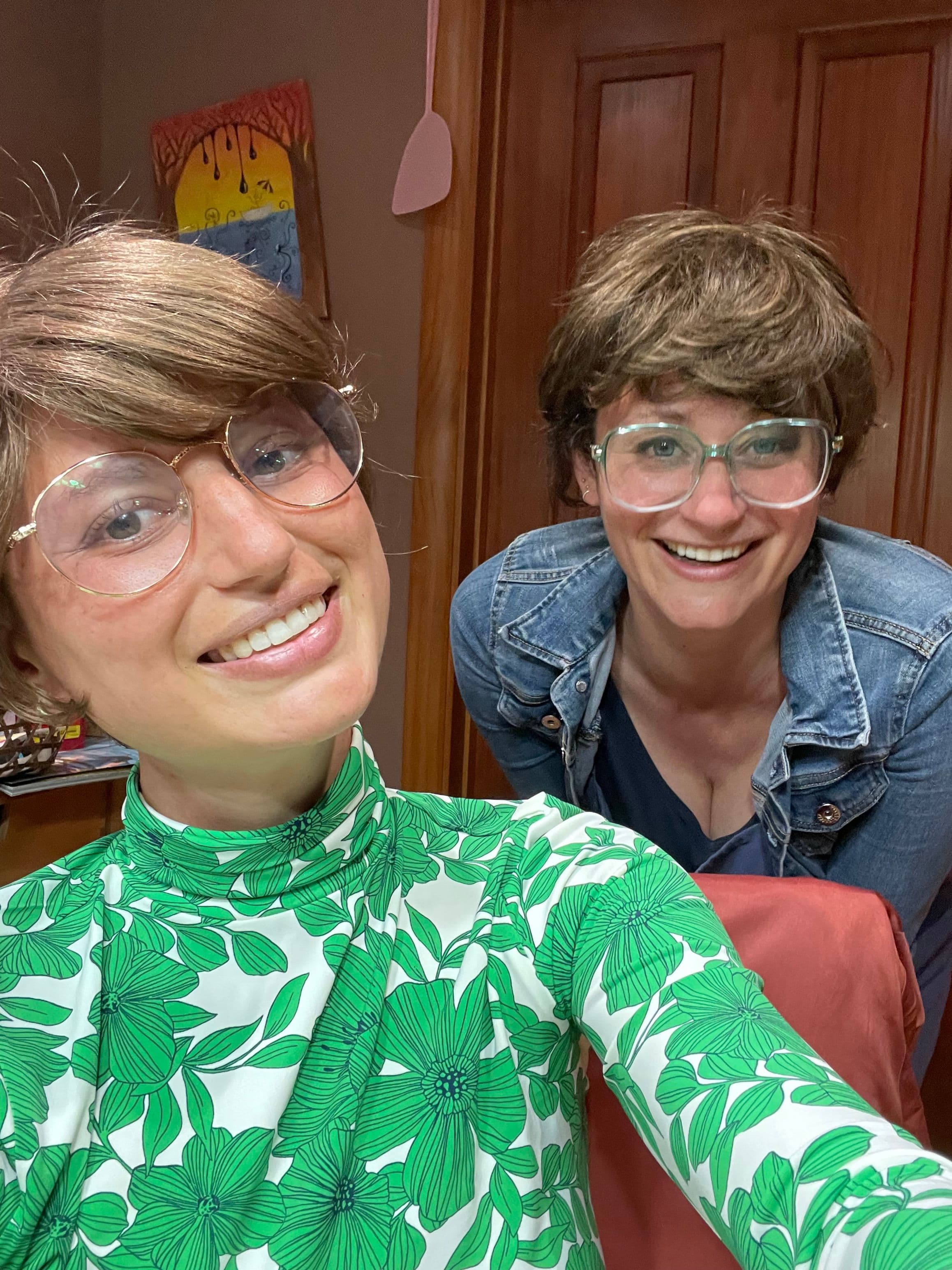 Sarah with her sister both wearing wigs (though Sarah's sister was wearing hers just for fun; she didn't do chemo).